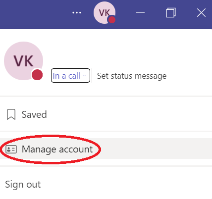 1. Go to Manage Account by clicking on your Profile Icon on top right of Microsoft Teams.