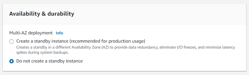 7. Evaluate Multi-AZ Deployment: Evaluate whether your workload requires Multi-AZ (availability zone) deployment for high availability and disaster recovery purposes. While Multi-AZ deployments provide redundancy, they come with higher costs due to the standby instance. If high availability is not critical for your workload, consider using a single AZ deployment to save costs. To change Multi-AZ settings modify the instance and go to Availability and durability section.