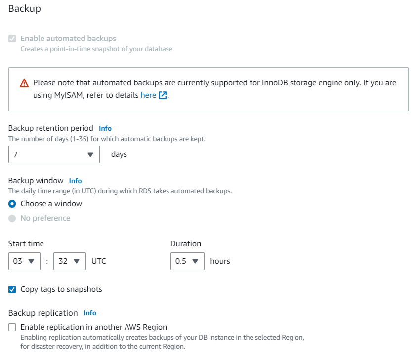 8. Optimize Backup and Retention: Review your backup and retention settings for RDS instances. Adjust the backup retention period and frequency based on your business needs. By reducing the backup retention period or frequency, you can minimize storage costs without compromising data protection. To change backup and retention settings modify the instance and go to Additional Configuration section.
